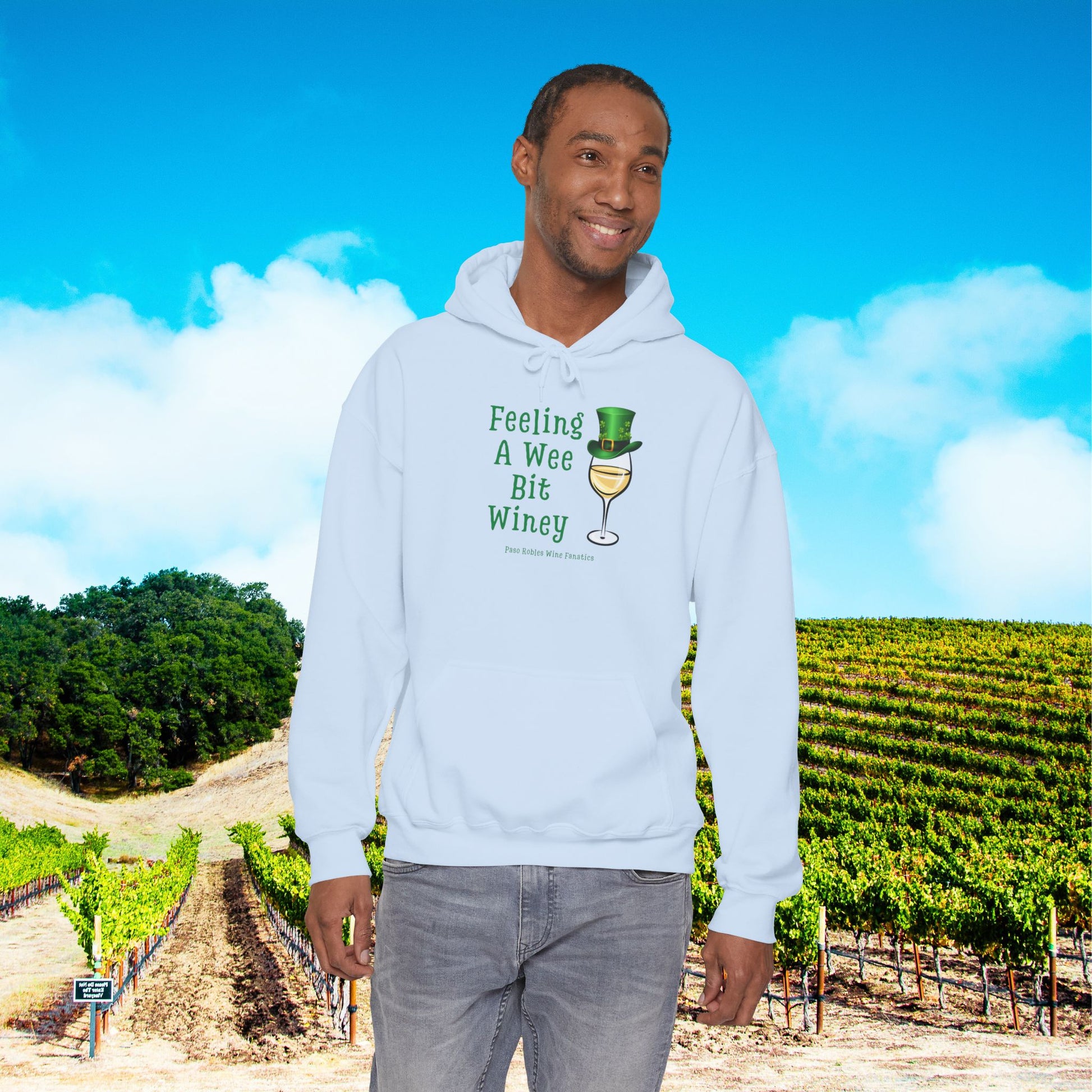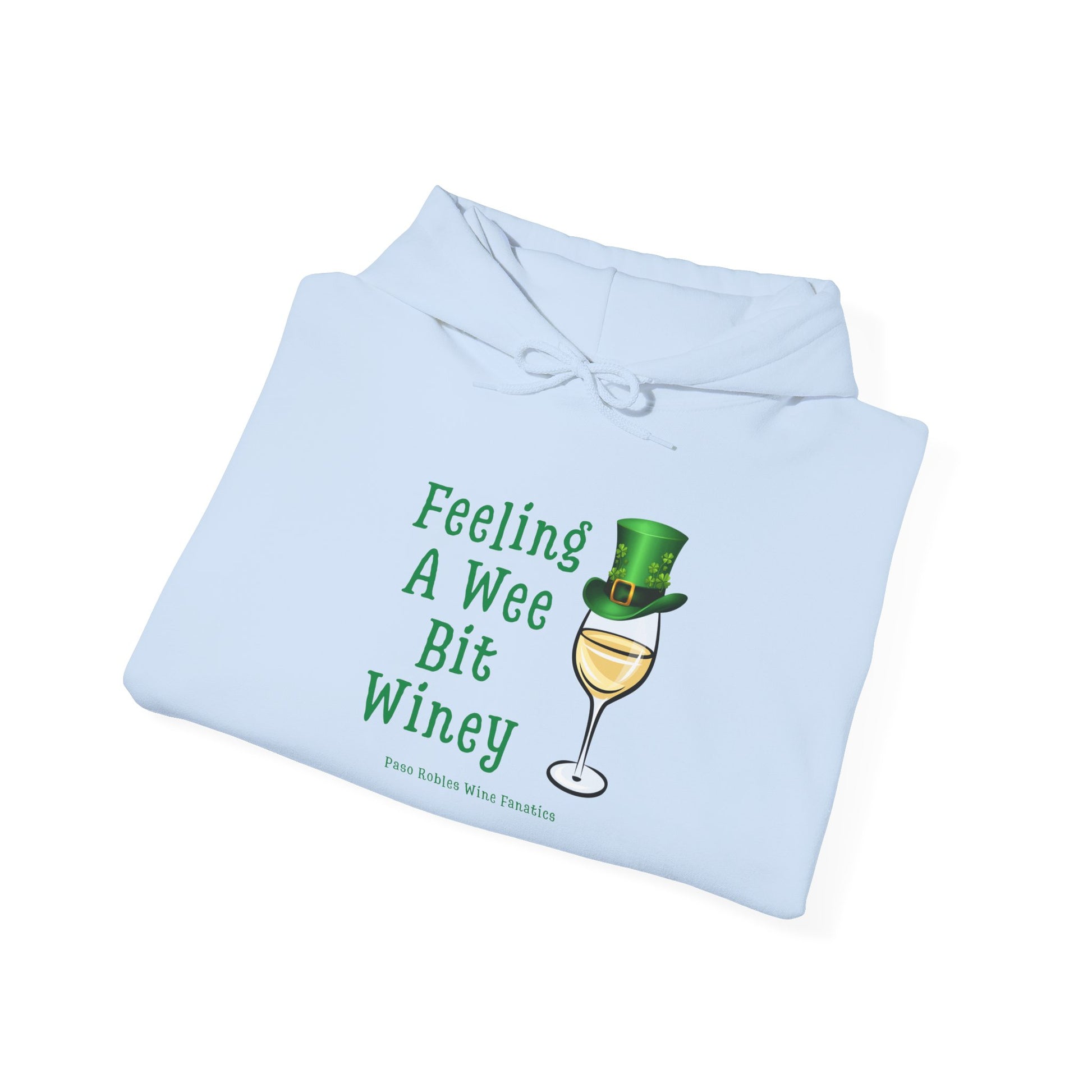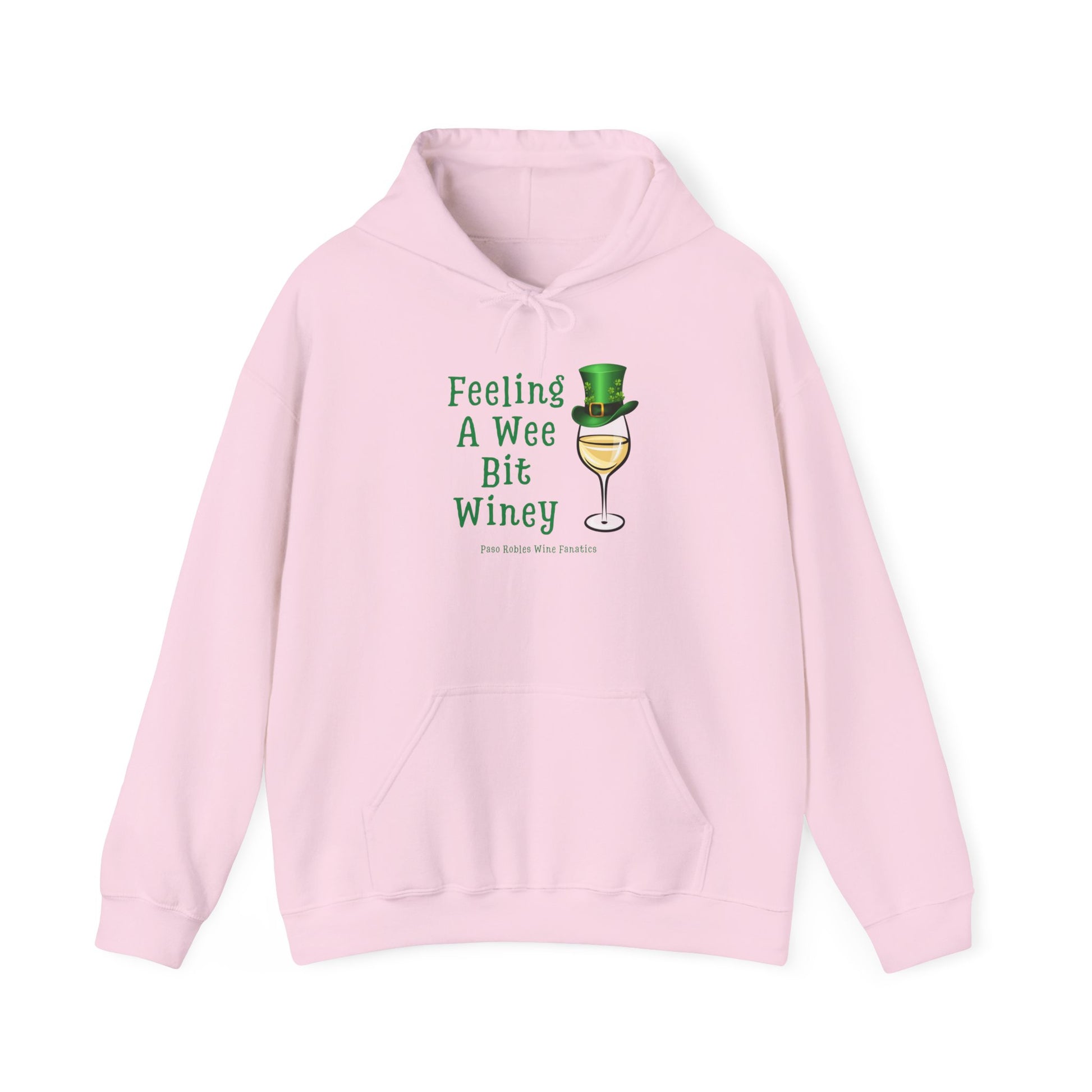 Slip into cozy humor with this soft, midweight hoodie that wears its charm lightly. A whimsical wine glass wearing a tiny green top hat accompanies the playful phrase “Feeling A Wee Bit Winey,” making this hoodie a quiet wink for anyone who loves good laughs and slower evenings. The roomy kangaroo pocket and double-lined hood hold warmth and comfort; the tubular knit and classic fit make it easy to layer over a tee or under a jacket. Subtle, durable printing and optional embroidery placements keep the design looking crisp wash after wash. Wear it to low-key gatherings, casual pub nights, or a relaxed walk home with a takeout bottle—this hoodie feels like the warm, cheeky friend you want nearby on chill nights.