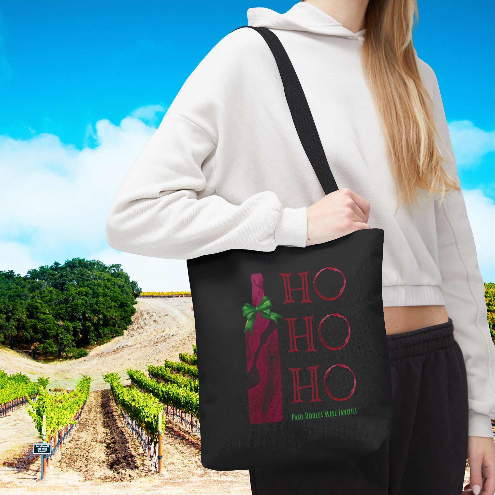 Show off your love for Paso Robles Wine with this stylish and durable Ho Ho Ho Tote Bag. Perfect for everyday use, this tote bag is made of 100% polyester with 5 color handle options and reinforced stitching on the handles. Whether you're heading to the vineyard or running errands, this tote bag is a must-have for wine enthusiasts.