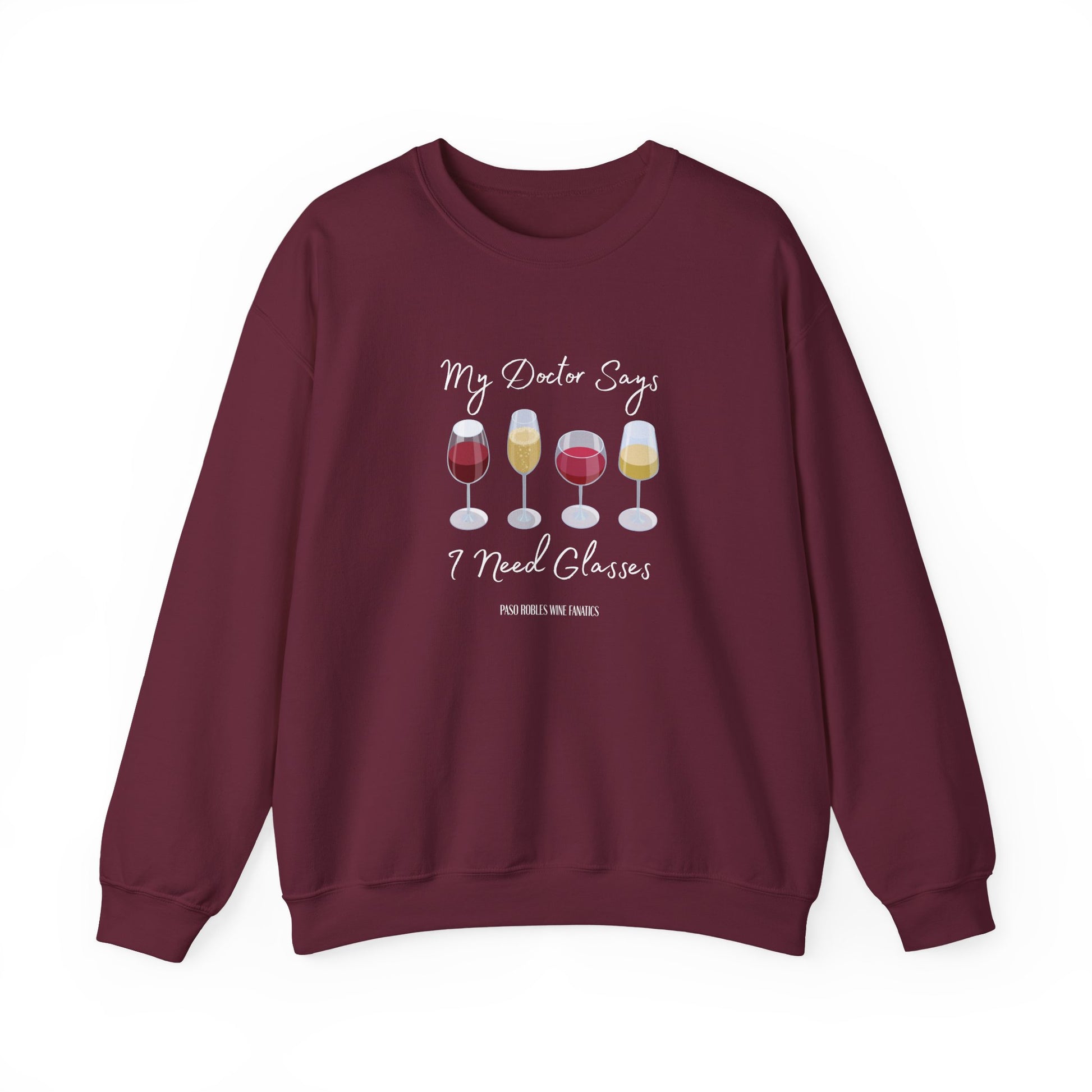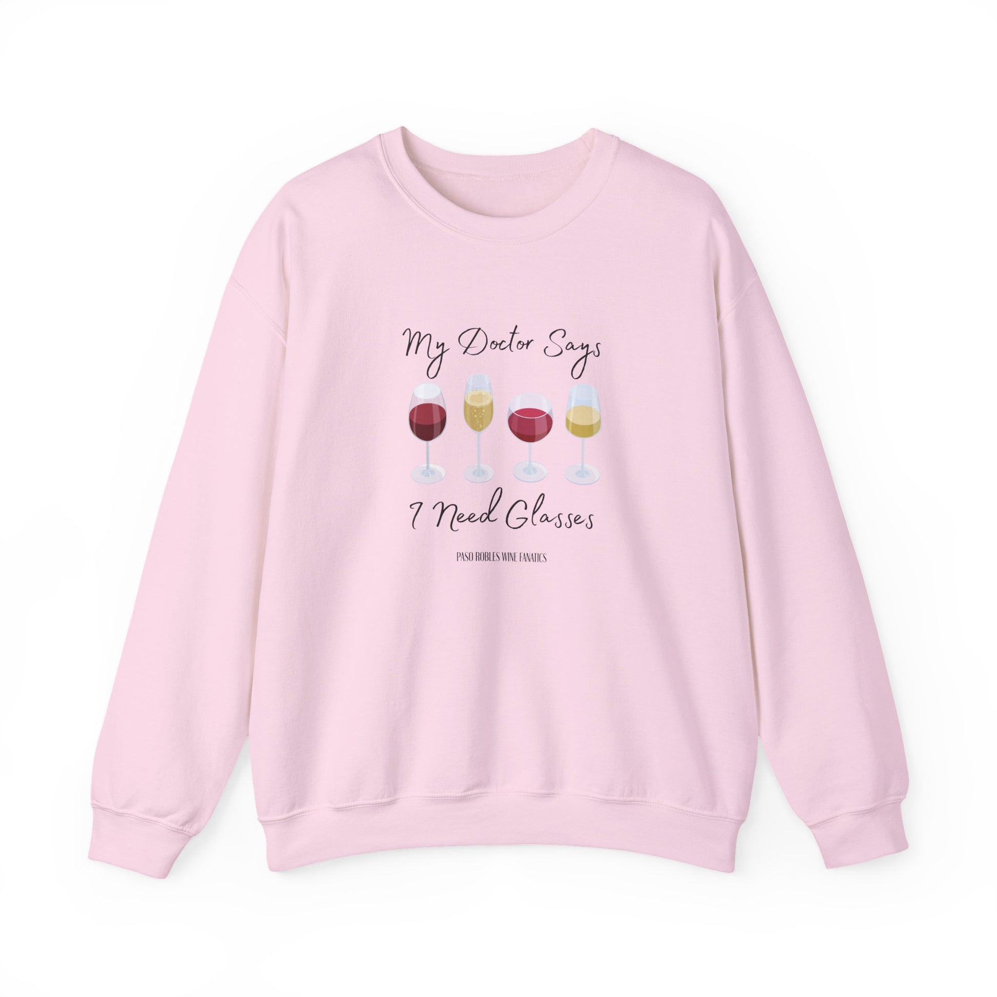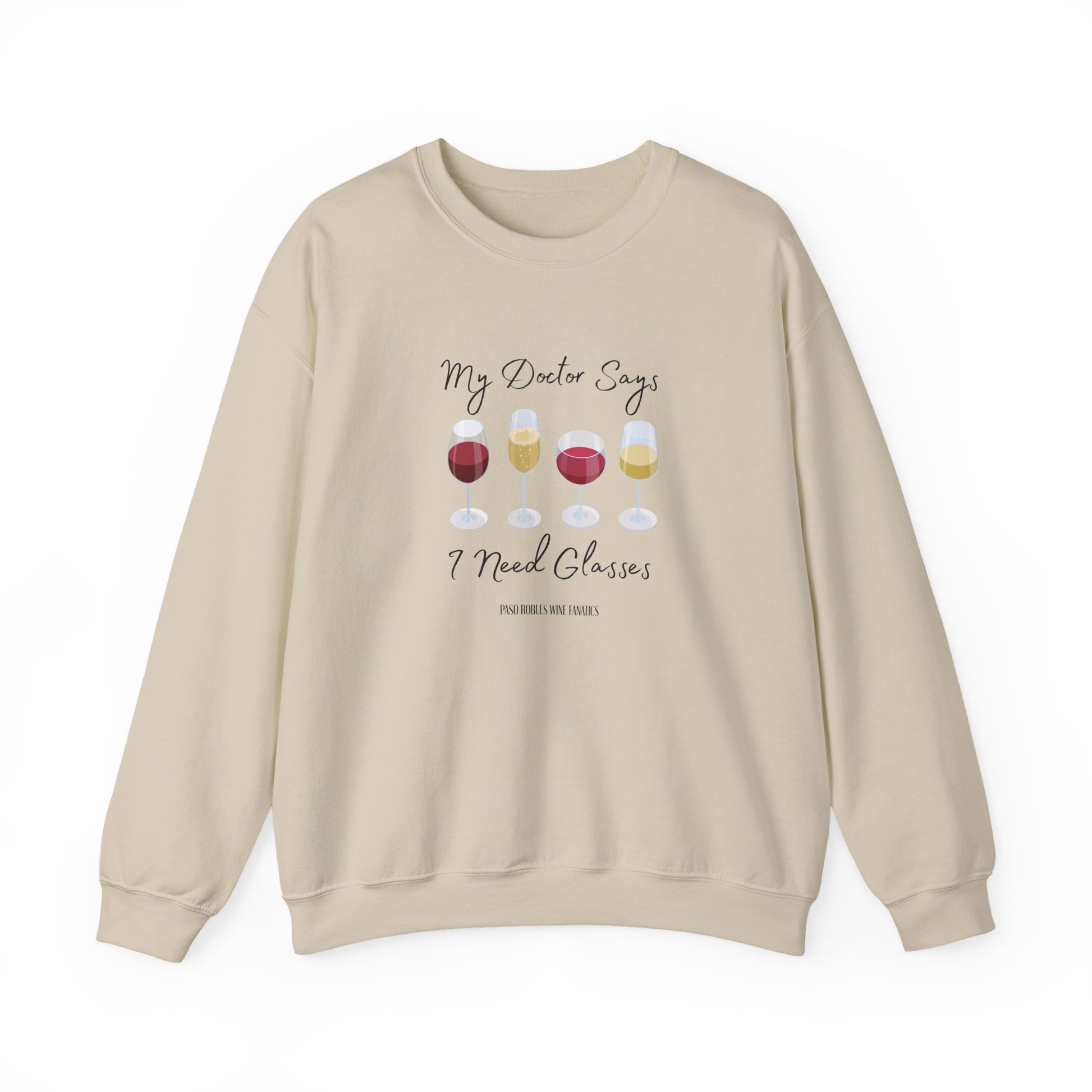 A cozy My Doctor Says I Need Glasses Sweatshirt perfect for wine lovers looking for a stylish and comfortable option to wear during casual gatherings or relaxing at home. This sweatshirt exudes a laid-back vibe and is ideal for wearing during wine tastings, girls' nights, or your next wine tasting adventure!