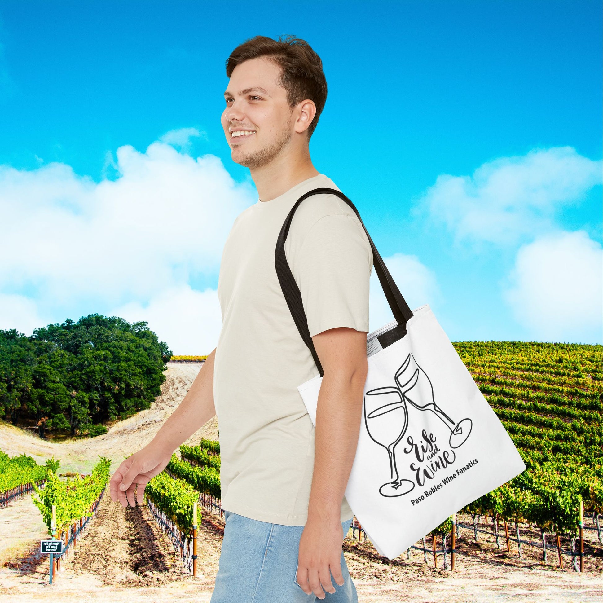 Show off your love for Paso Robles Wine with this stylish and durable Rise & Wine Tote Bag. Perfect for everyday use, this tote bag is made of 100% polyester with 5 color handle options and reinforced stitching on the handles. Whether you're heading to the vineyard or running errands, this tote bag is a must-have for wine enthusiasts.